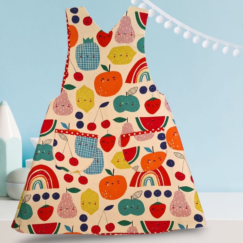 Made of 100% cotton and with additional poppers on the shoulder straps for lengthening as required. Front and back pockets on one side only but perfect to hold all those “special treasures”