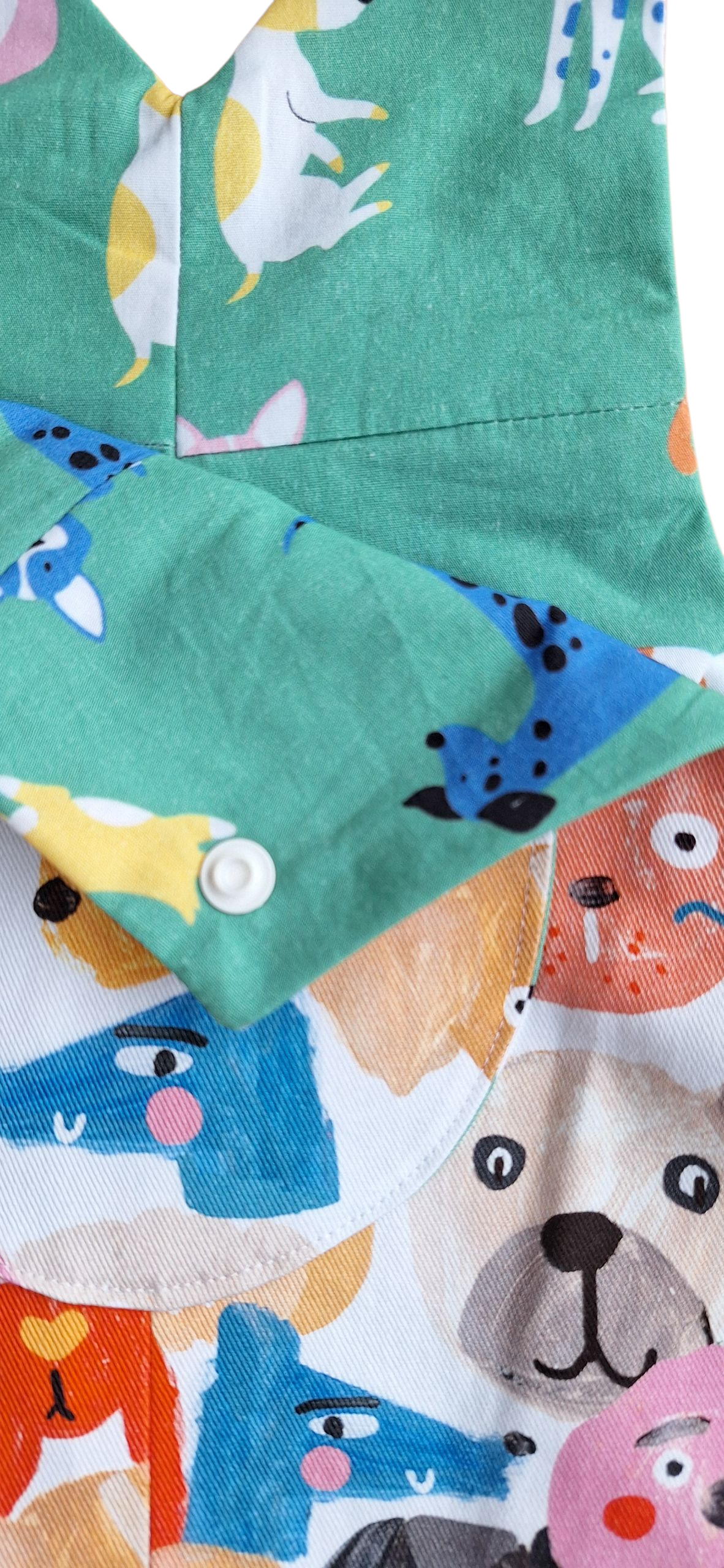 Made of 100% cotton and with additional poppers on the shoulder straps for lengthening as required. Front and back pockets on one side only but perfect to hold all those “special treasures”